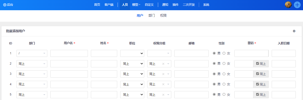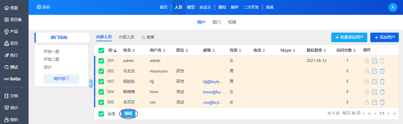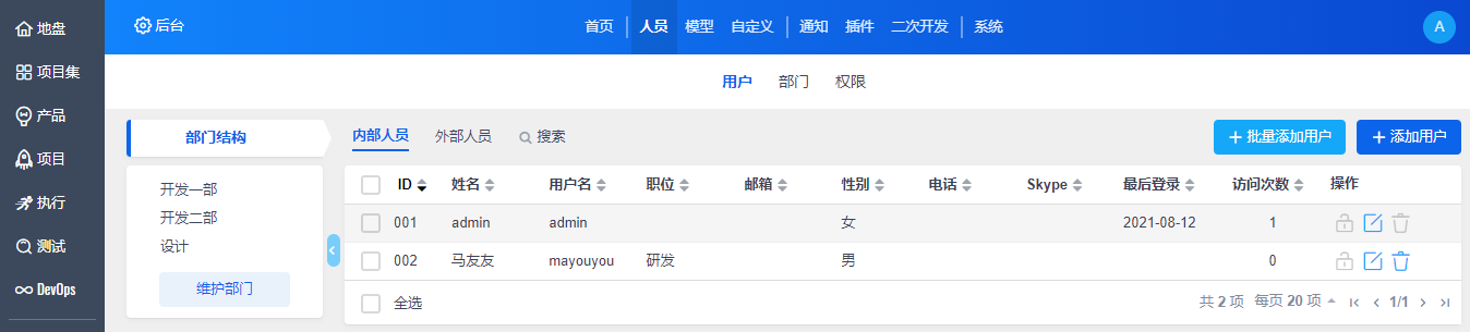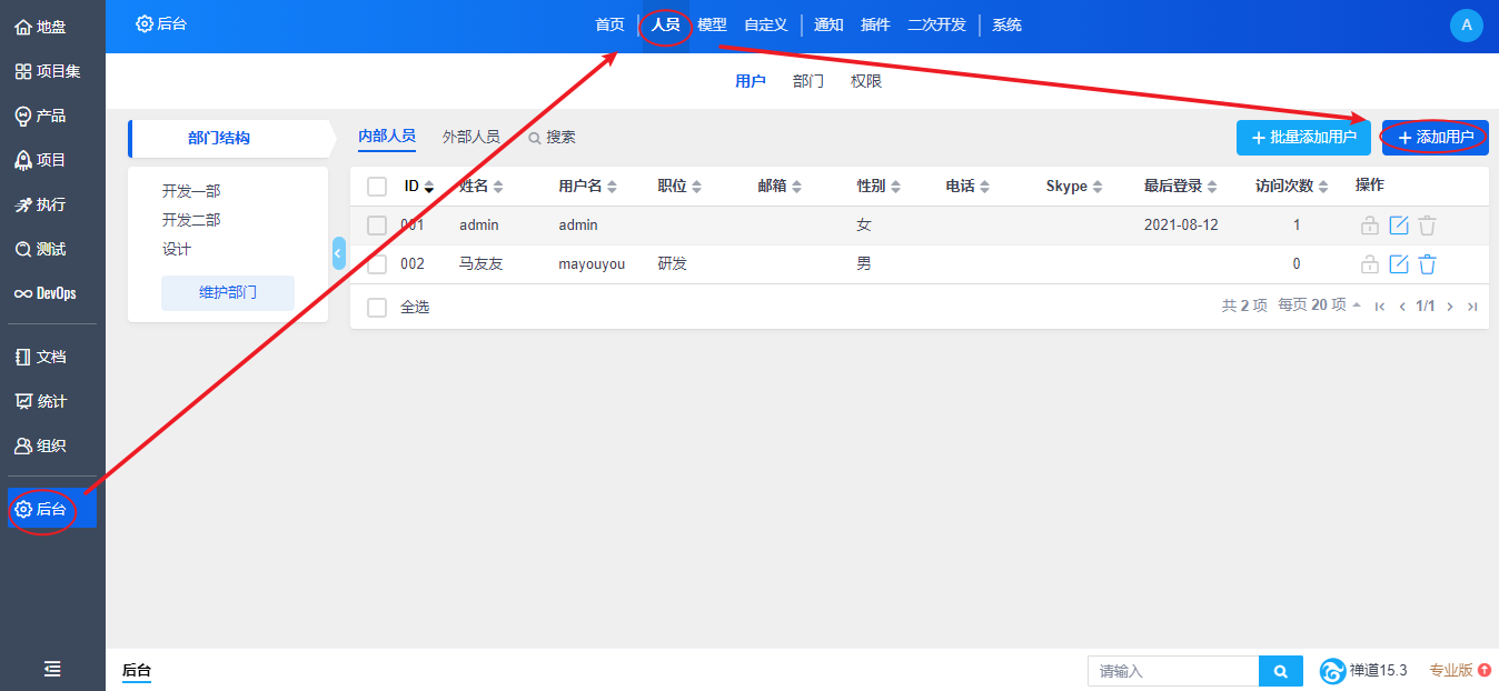管理员账号登录禅道,在“后台”-“人员管理”-“用户”下,可以添加、批量添加、以及批量编辑用户。
