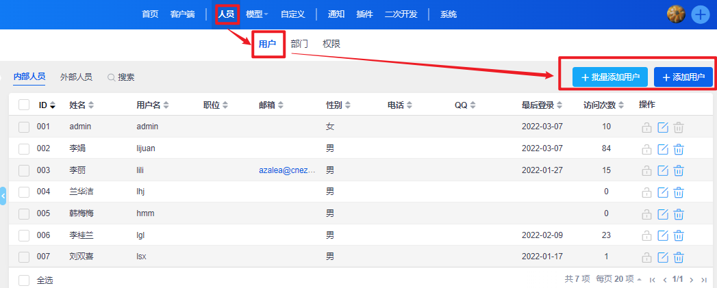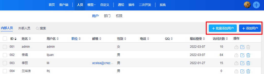 - 可以点击用户列表的右上角的添加用户、批量添加用户按钮,来添加新用户。