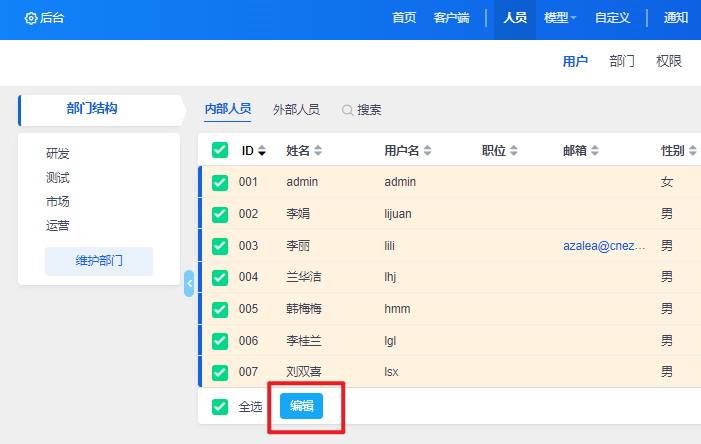 在用户列表页面,可以点击“全选”或者选中多个用户,点击“编辑”,进行用户的批量编辑操作。