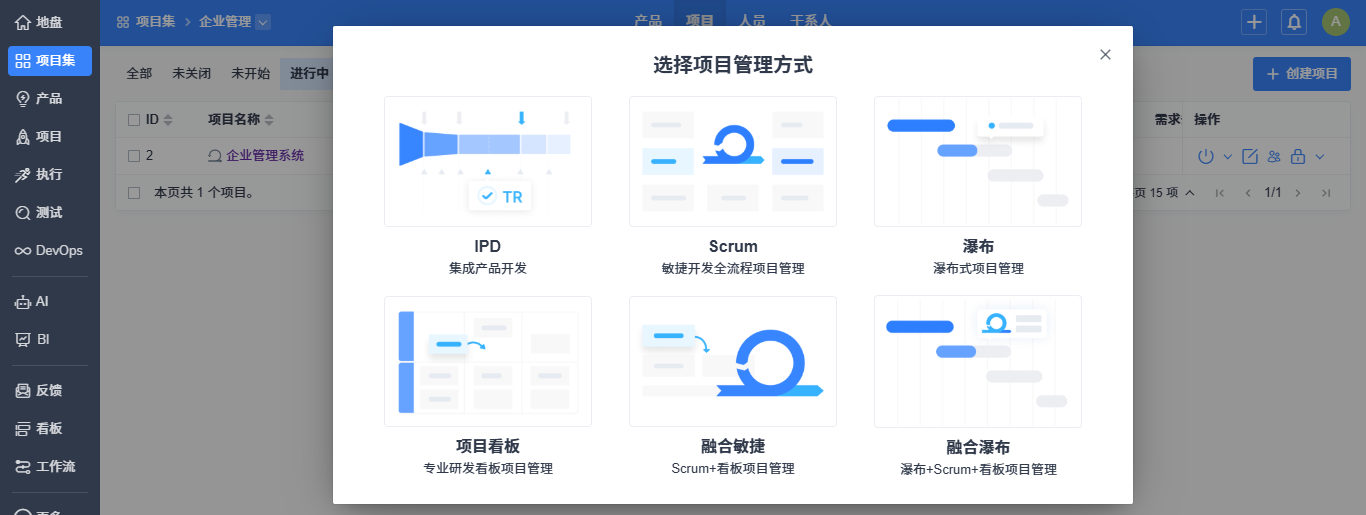 进入创建项目页面后,先进入项目管理方式的选择:IPD、Scrum、瀑布、项目看板、融合敏捷和融合瀑布项目