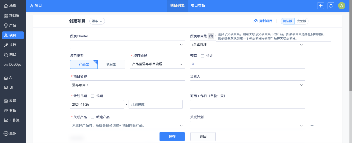 创建项目页面,默认当前项目集为父项目集。若不选择父项目集,则创建独立项目。