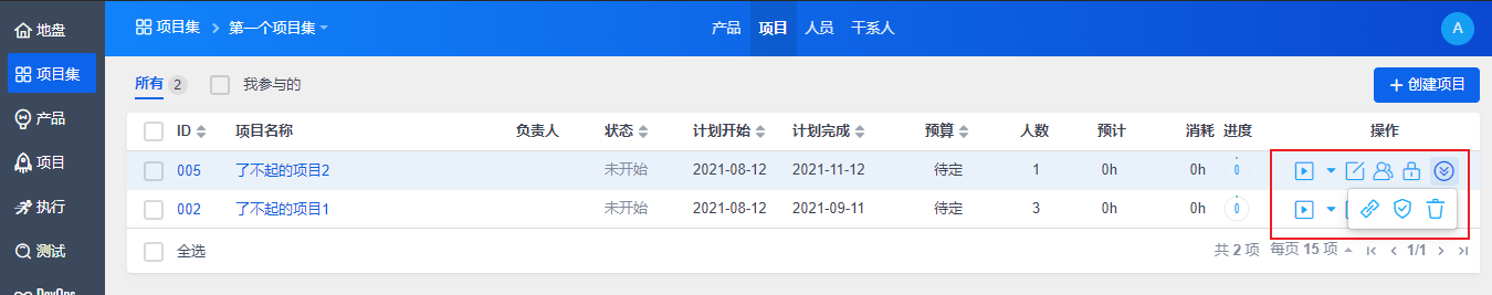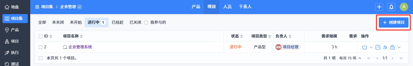 在项目集下,可以创建项目并查看项目集所有的项目。如点选择“第一个项目集”,点击“项目”-“创建项目”。