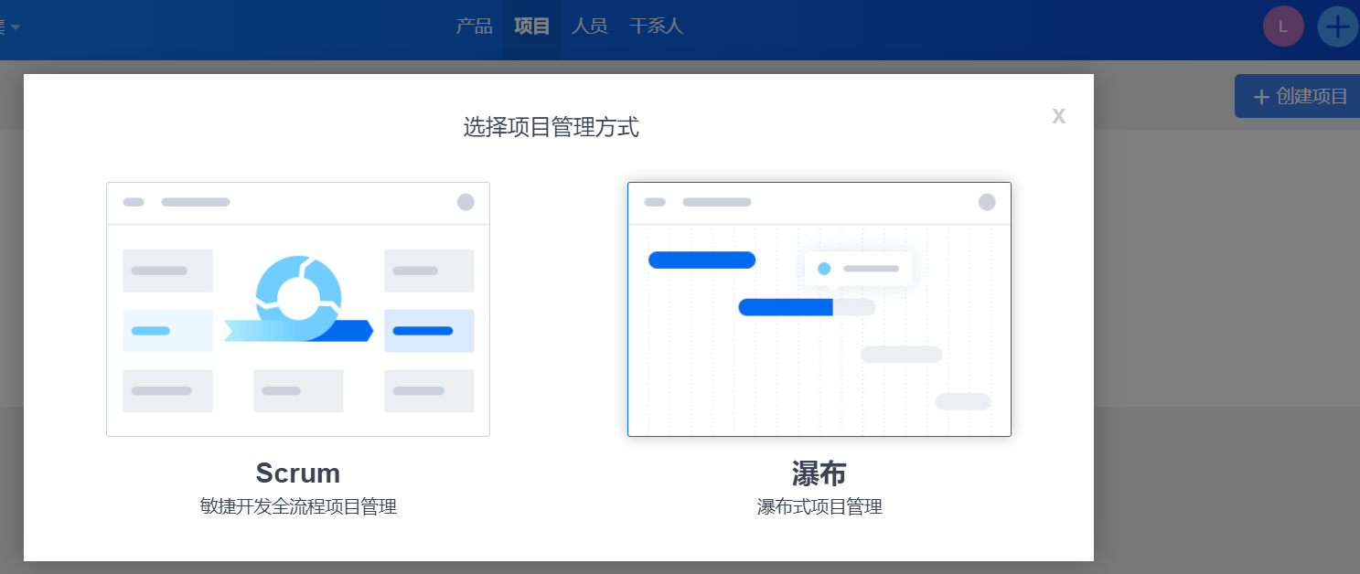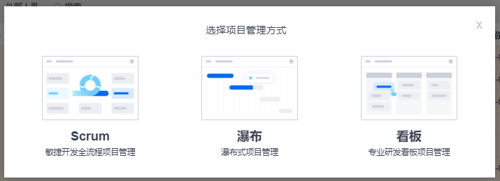 进入创建项目页面后,先进入项目管理方式的选择:IPD、Scrum、瀑布、项目看板、融合敏捷和融合瀑布项目