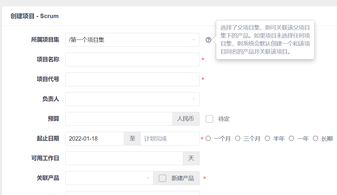 创建项目页面,默认当前项目集为父项目集。若不选择父项目集,则创建独立项目。