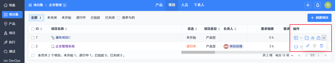 点击“保存”后,返回项目列表。可以通过操作按钮对项目管理,包括管理人员、关联产品、管理权限分组等。