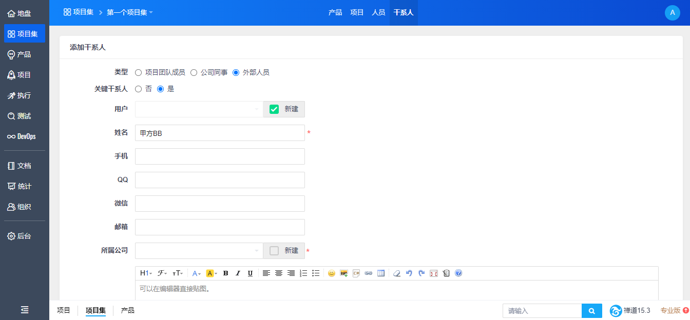 项目集负责人在禅道中如何添加干系人, 可观看视频了解详情:https://www.zentao.net/redirect-index-20668.html