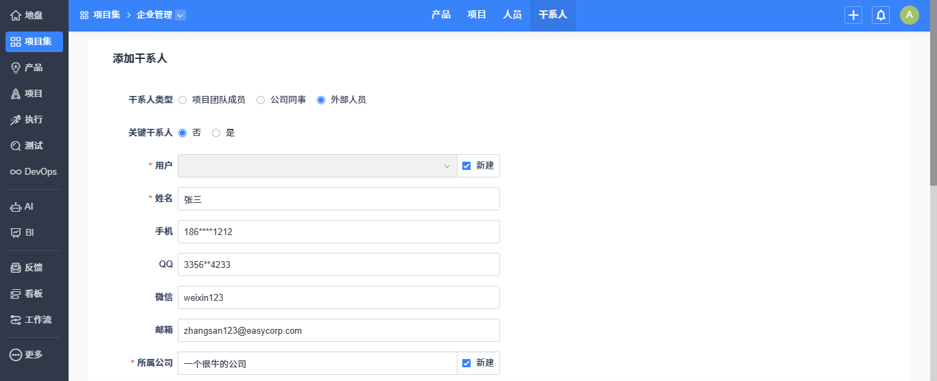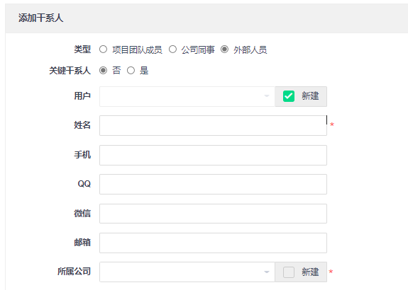 点击“添加干系人”,进入添加页面。当干系人类型为“外部人员”时,需要创建用户。