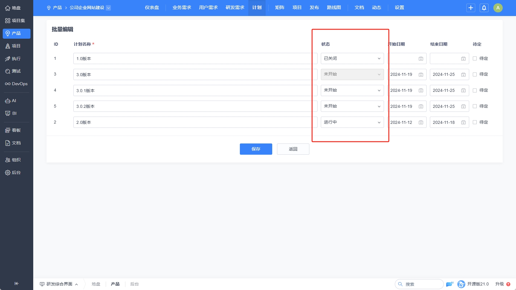 计划的状态有:未开始、进行中、已完成、已关闭。进入计划列表页时,默认进入进行中的计划列表页。