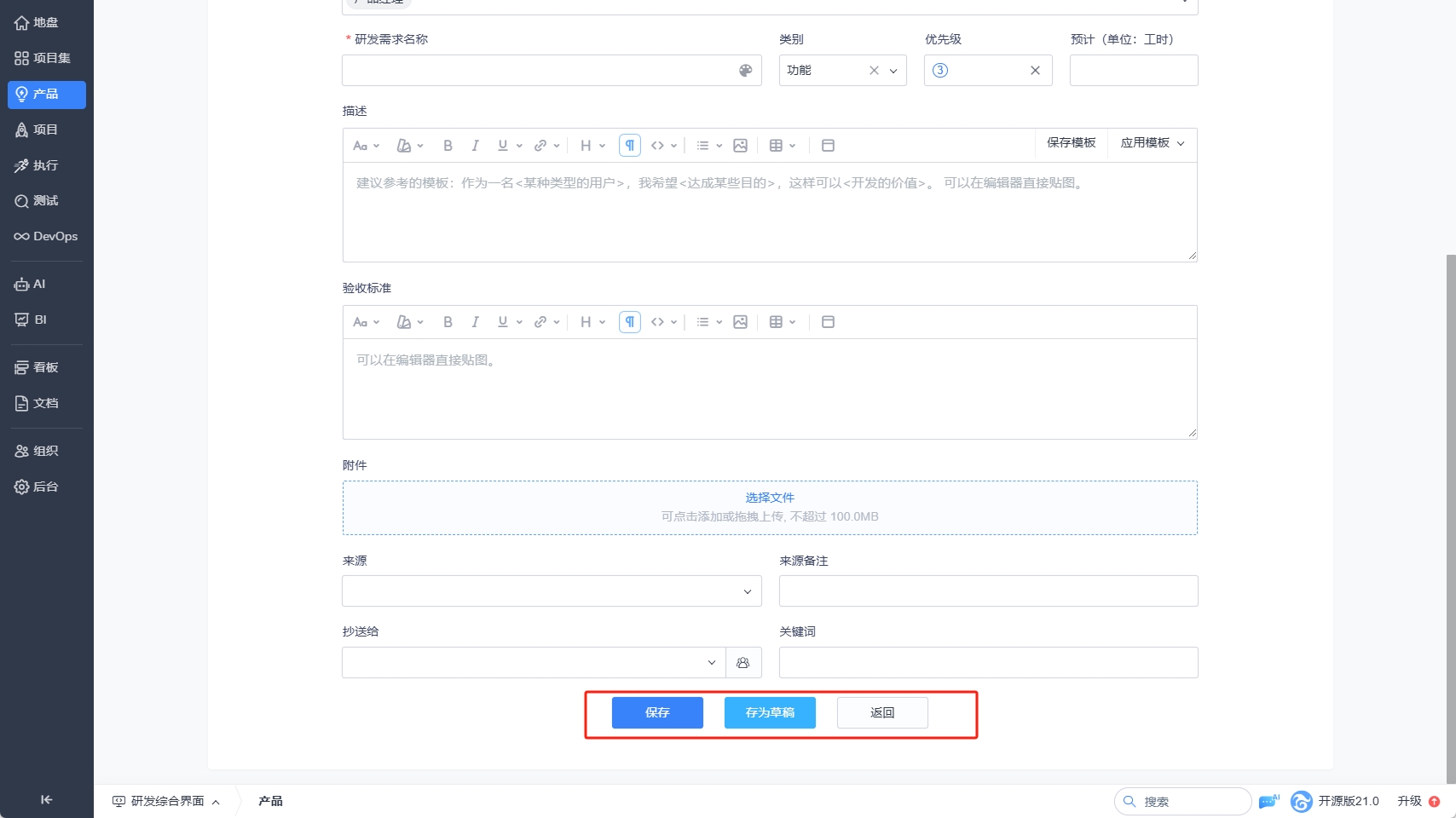 - 未编辑完的需求可以点击【存为草稿】按钮,保存为草稿状态,待编辑完成再选择提交评审或直接激活。