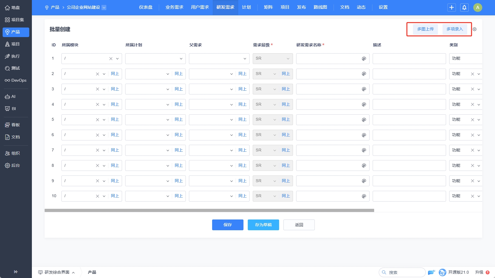 “多图上传”是通过批量上传图片作为需求。图片的名称默认为需求的名称。