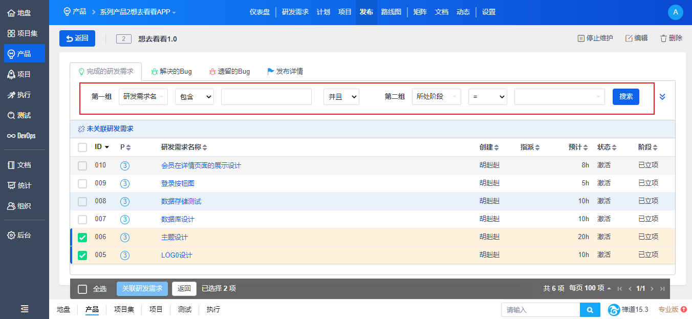 点击“保存”后,进入该发布详情页面。需要为此次发布关联需求、已解决BUG、以及遗留BUG。可以通过设置条件,进行“搜索”,然后批量关联。