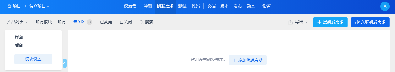 项目中的需求:进入到具体项目后,既支持直接点击提需求按钮来添加,也支持直接关联项目所属产品的需求,项目下执行的需求会同步到项目需求中。