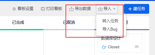 - 导入任务:可以导入所属项目相同的已关闭的执行的未完成和进行中的任务