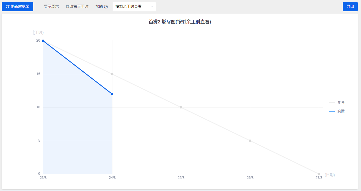 燃尽图是以图表展示随着时间的减少工作量的剩余情况。工作量一般以竖轴展示,时间一般以横轴展示。