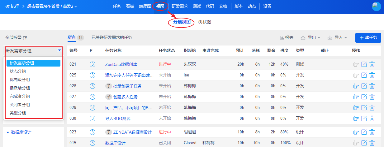 可以按照分组查看任务,分组包括按研发需求、任务状态、优先级、指派给、完成者、关闭者和类型进行查看。