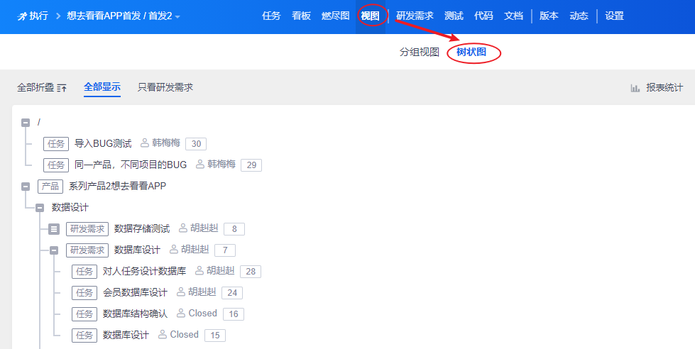 也可以以树状图查看。任务按照“产品”-“需求模块”-“需求”的层级进行展示。
