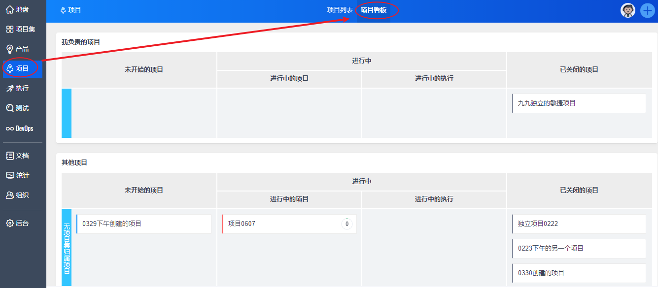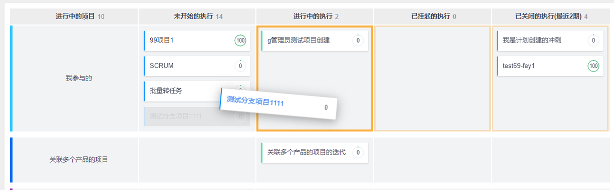 禅道15.5+增加了项目看板功能,您可以通过该功能查看项目和执行的状态。点击项目看板上的对象名称即可直接进入相关页面进行查看。