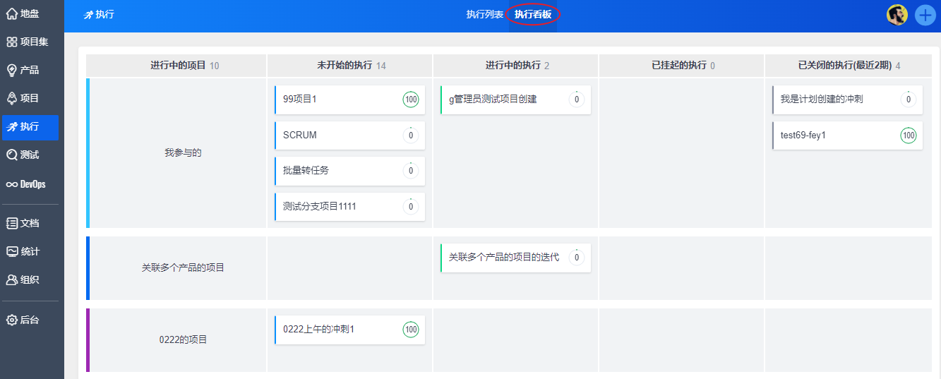 禅道的执行看板功能可以使用户通过该功能查看执行的状态。点击“执行”--“执行看板”,点击对象名称即可直接进入相关页面进行查看。