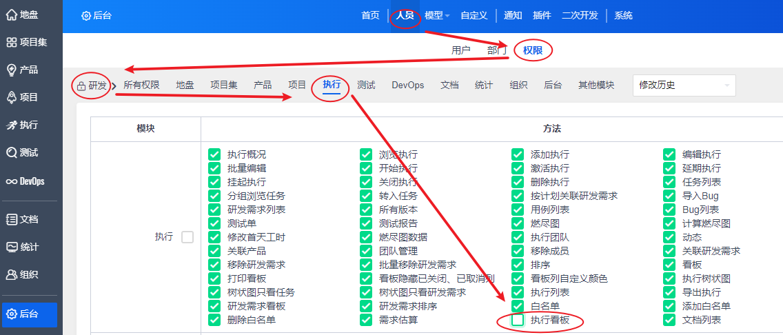 注:初次使用看板需要禅道管理员去“后台”--“人员”-“权限”中为相应的权限分组勾选执行看板的权限。