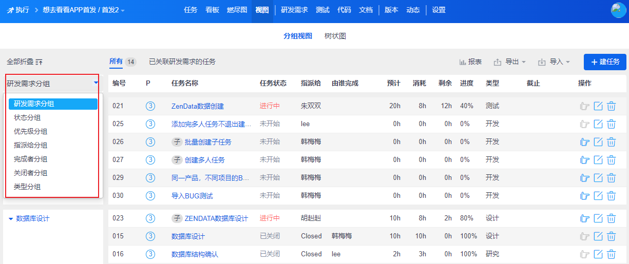 可以按照分组查看任务,分组包括按研发需求、任务状态、优先级、指派给、完成者、关闭者和类型进行查看。