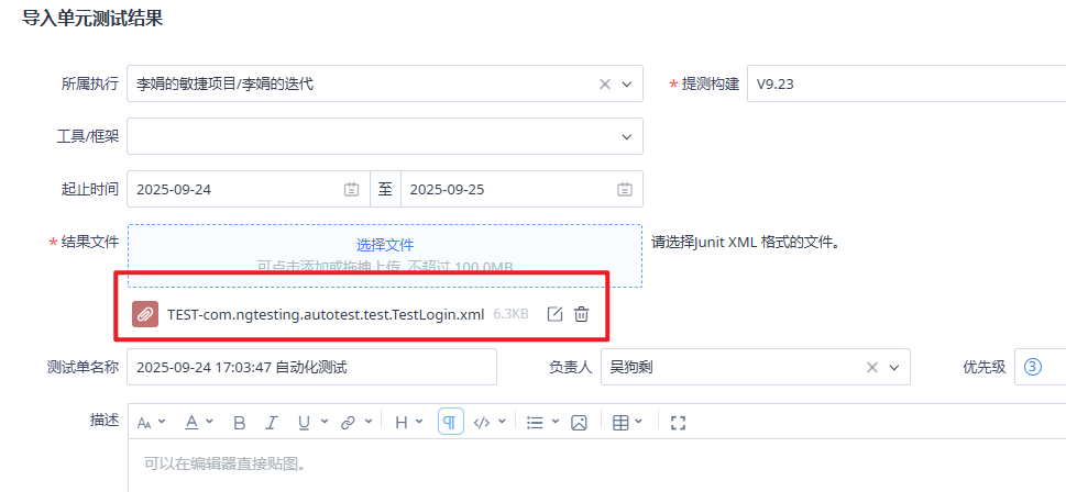跳转到导入单元测试结果页面,填写字段信息,上传结果文件,点击保存。