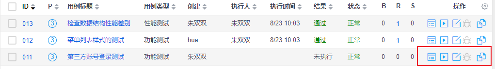 在“测试”-“用例”-“操作”下,点击“操作”按钮栏进行测试工作。
