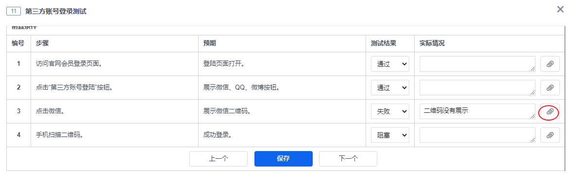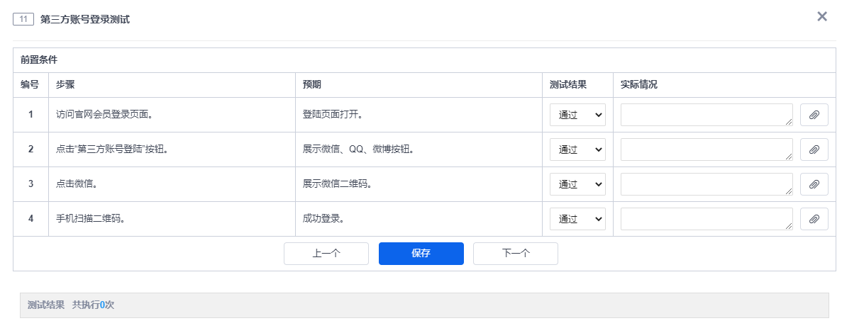 点击用例的“执行”按钮。填写测试结果,包括“忽略”、“通过”、“失败”、和“阻塞”四种结果。默认结果为“通过”。