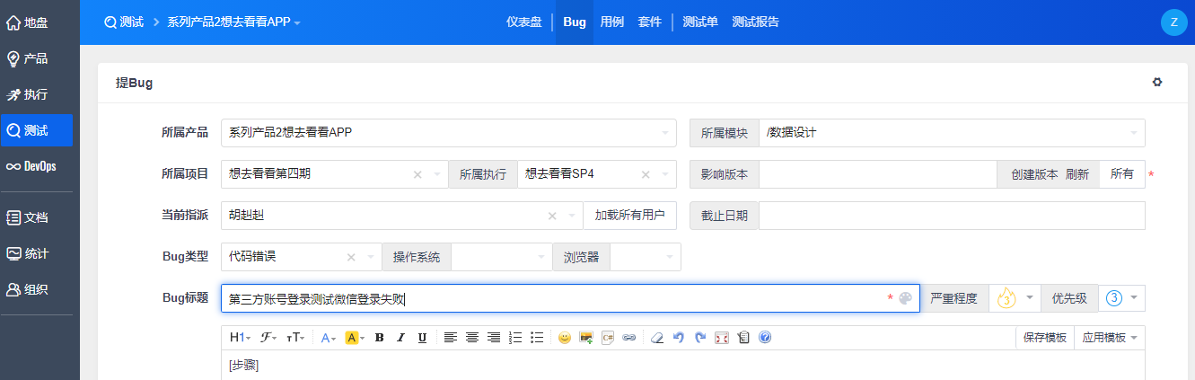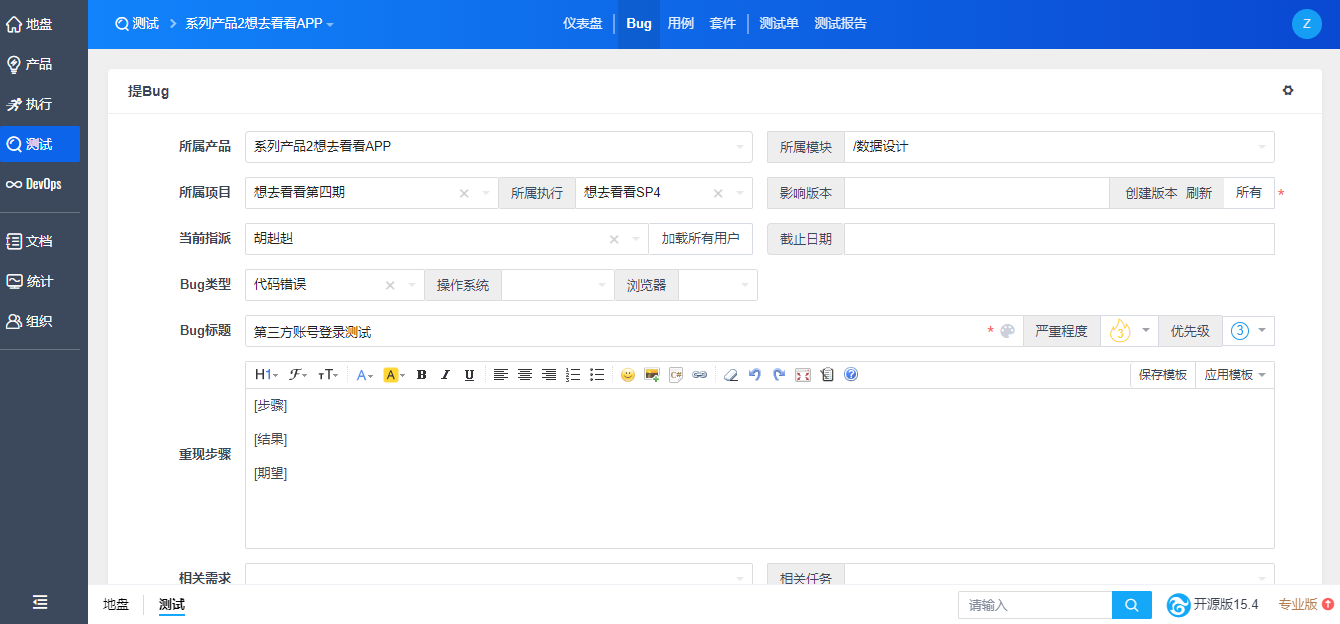点击“转Bug”,则跳转至“测试”-“Bug”下的"提Bug"页面。