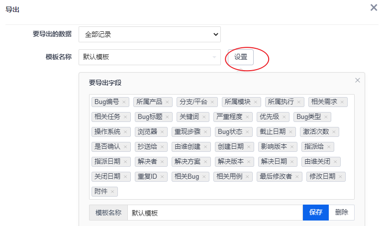 可以导出全部Bug记录,或者在Bug列表中选中想要导出的Bug进行导出。点击“设置”。可以设置导出的模板,选择要导出的字段并保存为模板,可供下次快速导出使用。
