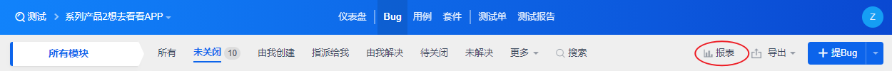 点击“Bug”-“报表”可以统计分析查看Bug。