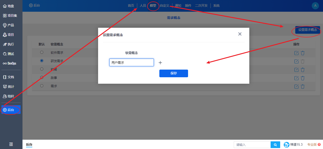 在“后台”-“模型”-“需求概念”下,管理员还可以添加需求概念。点击“设置需求概念”,在输入框中填写概念。