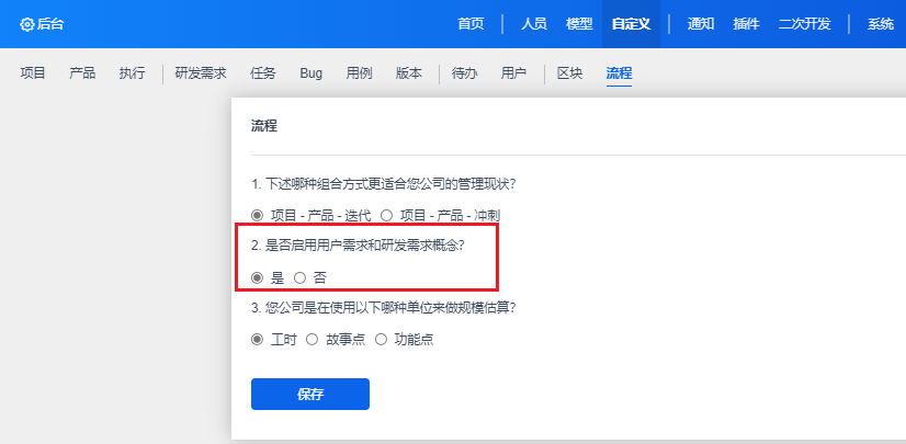 如果在“后台”-“自定义”-“流程”下,设置了启用用户需求和研发需求概念,请注意以下内容。