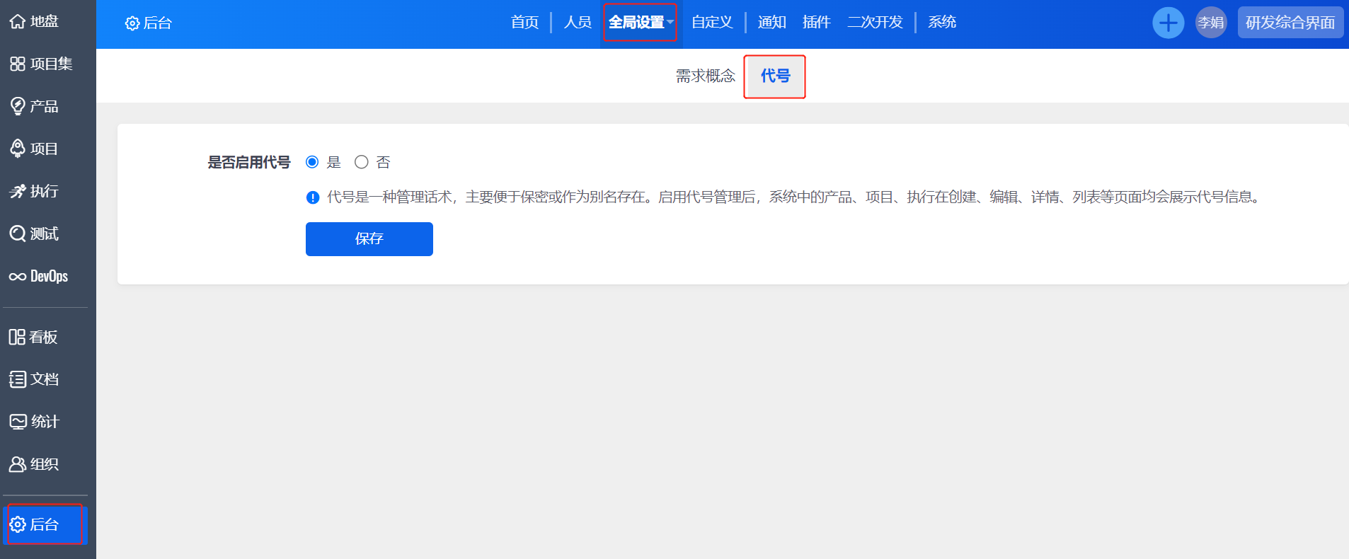 - 代号启用后,创建产品、项目、执行时都需要填写代号,且不能重复。(已删除的产品、项目、执行不参与校验)