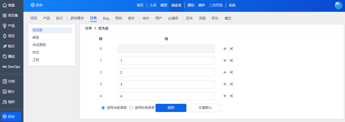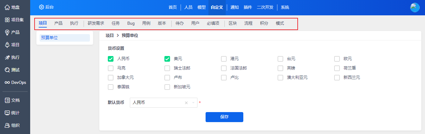 如上图所示,在“自定义”-“项目”下,可以设置项目预算的单位。禅道系统中默认的预算单位人民币和美元。