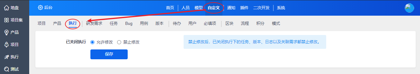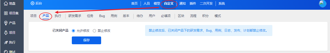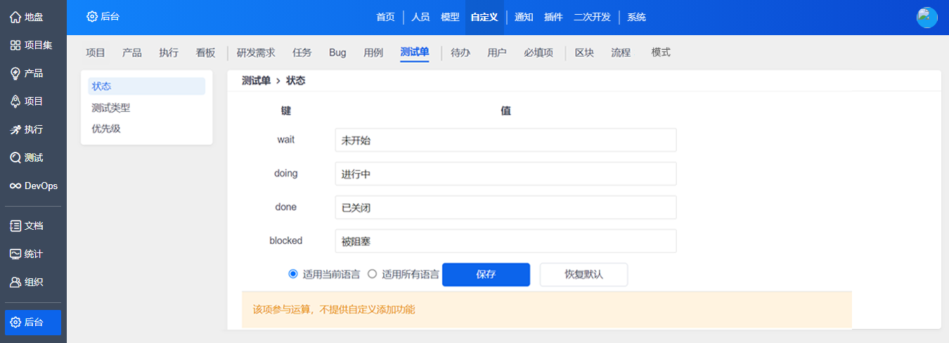 在“自定义”-“测试单”下,对测试单相关的字段进行自定义。