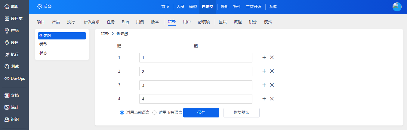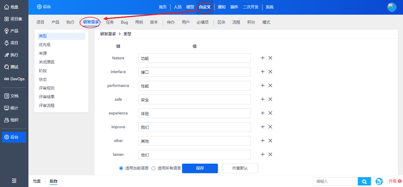 在“自定义”-“研发需求”下,对需求相关的字段进行自定义。