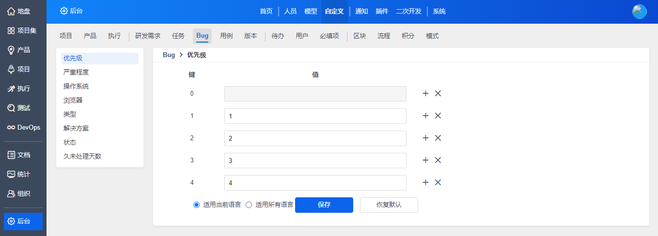 在“自定义”-“Bug”下,对Bug相关的字段进行自定义。