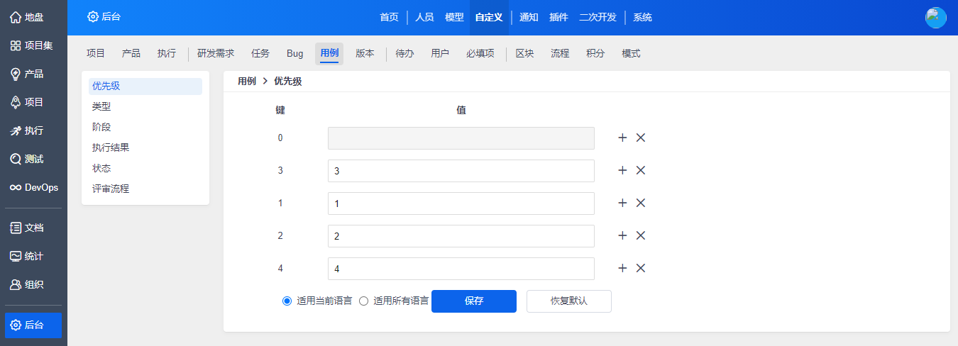 在“自定义”-“用例”下,对用例相关的字段进行自定义。
