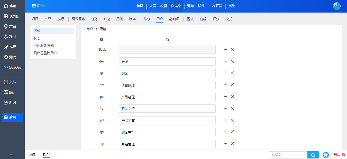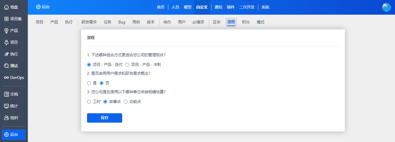 在“自定义”-“流程”下,对适合自己团队的概念、流程等进行设置。你的选择将在禅道功能中体现。