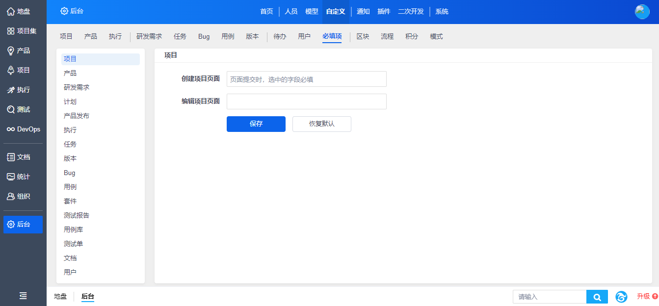在“自定义”-“必填项”下,对禅道内主要页面的必填项进行设置。