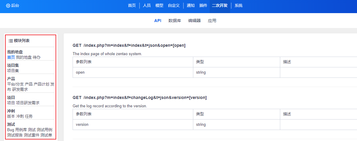 点击右侧“模块列表”可以查询禅道的API参数说明。API的使用可以参照《API机制》。