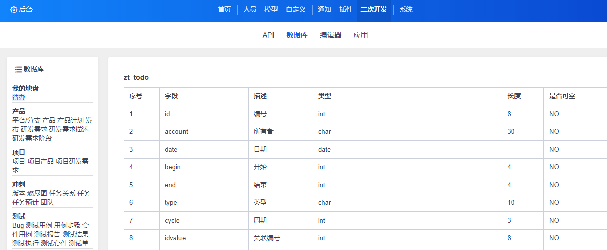 点击“后台”-“二次开发”-“数据库”,可以了解禅道的数据库设计。