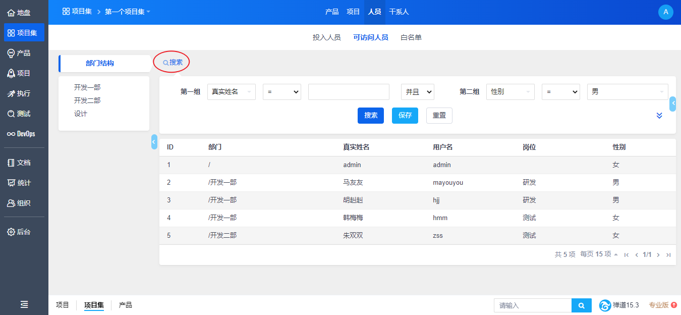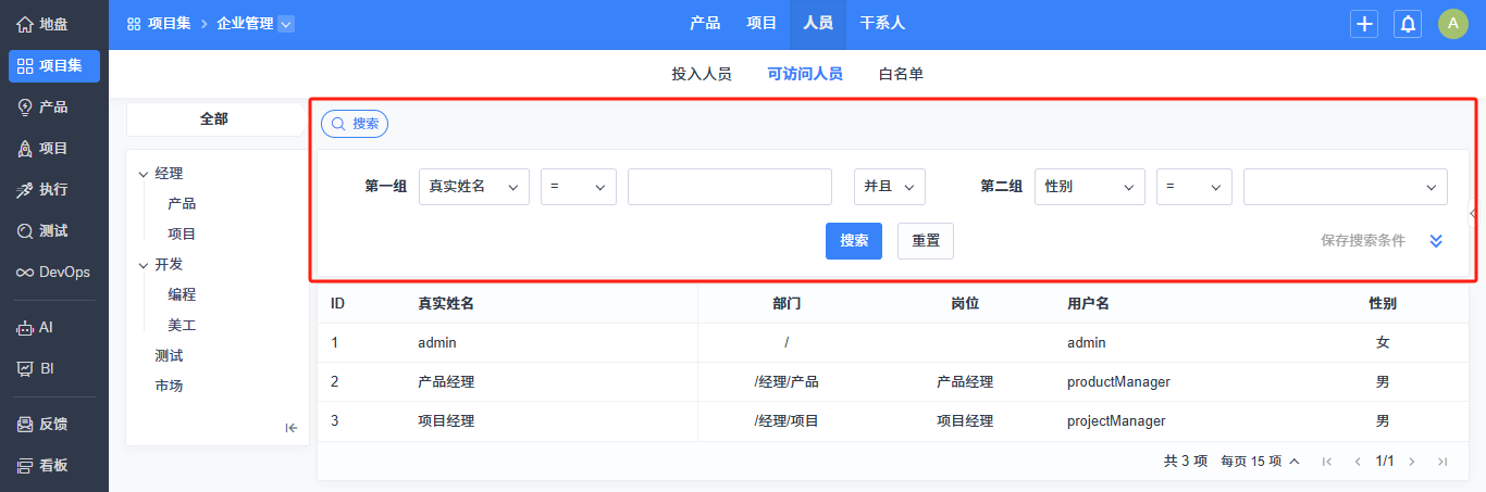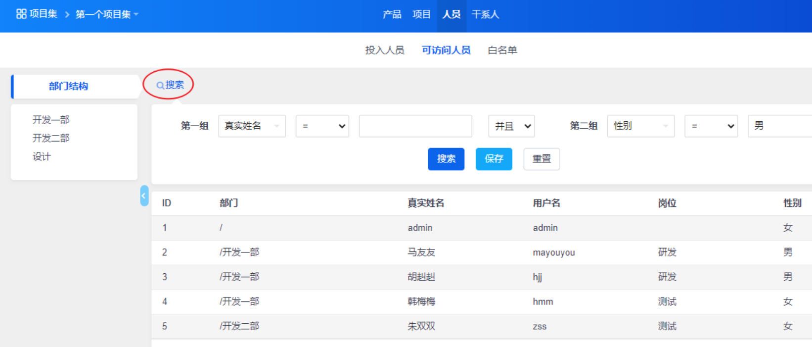 选择一个项目集,点击“人员”,可以对“投入人员”、“可访问人员”以及“白名单”进行查看和管理。
