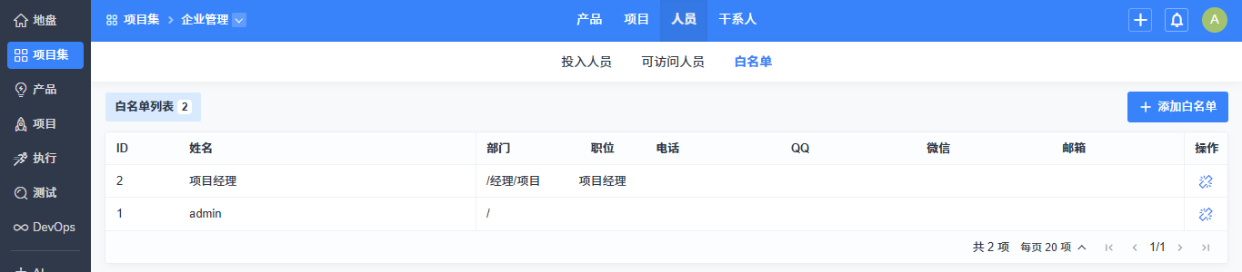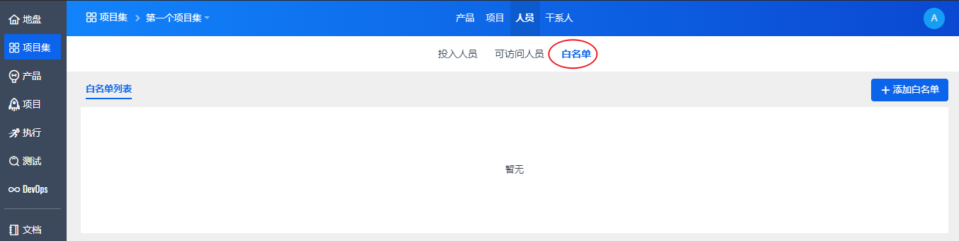 在“人员”-“白名单”页,可以添加公司内项目组人员外其他人员作为可访问该项目集的人员。