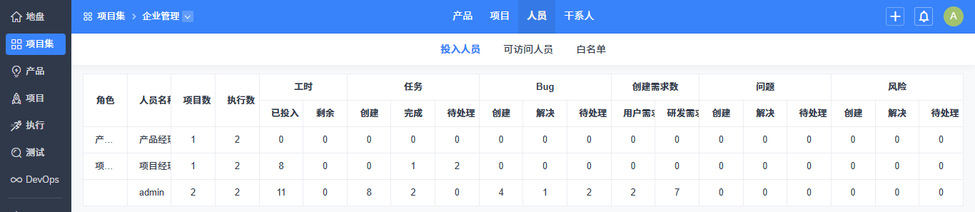 可以查看项目集投入人员的名称、角色以及参与的项目和执行数。人员相关工时、任务、BUG以及创建需求数也会列出。
