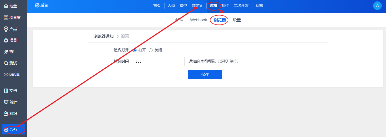点击“后台”-“通知”-“浏览器”。如果没有显示浏览器通知设置,需要联系管理员到组织--权限里分配浏览器设置的权限。
