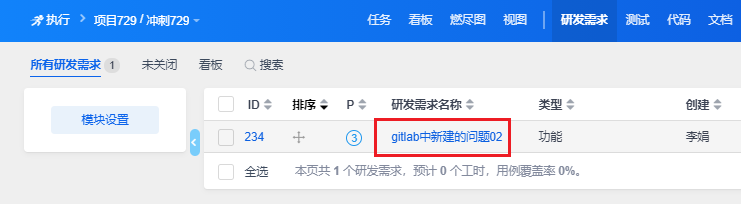 点击关联issue,可以跳转到关联issue页面,默认的类型有任务、需求、Bug三种。
