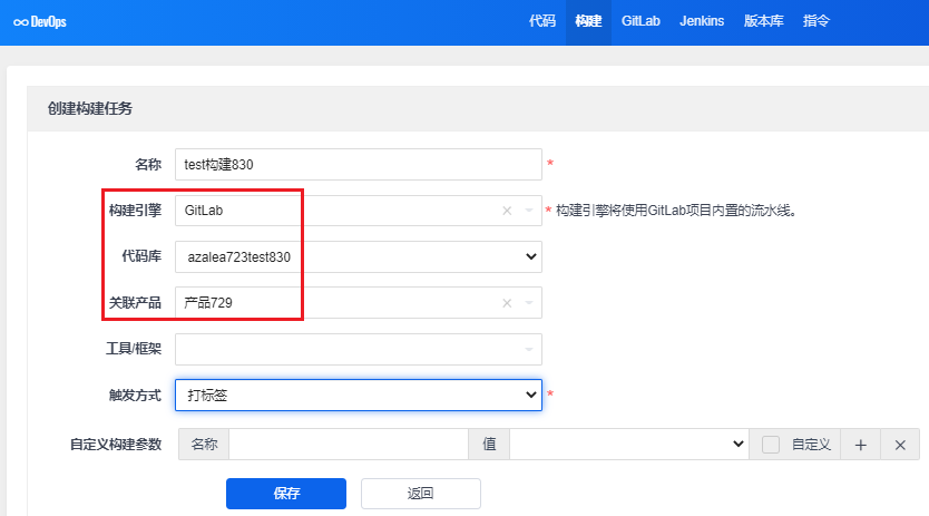 构建引擎选择GitLab,代码库会列出GitLab类型的代码库和所属产品。