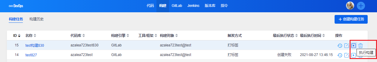 构建任务创建成功后,可以在构建列表里点击执行构建。