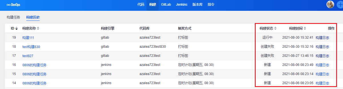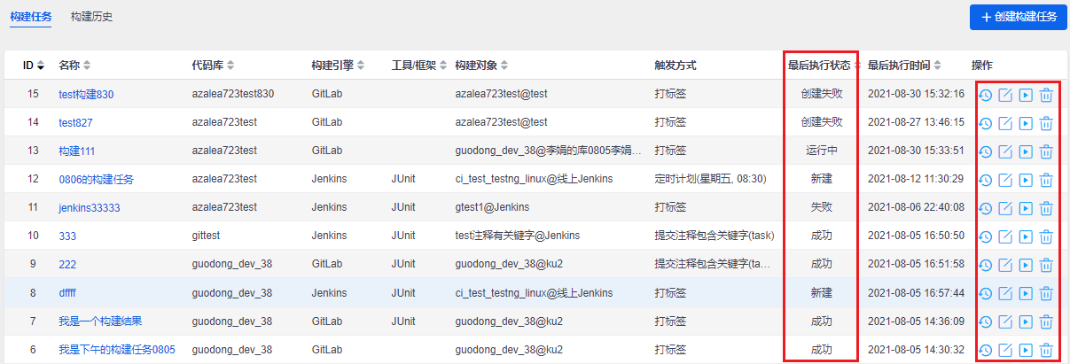 构建任务列表里,可以查看构建任务的状态,还可以对构建任务查看日志、编辑、执行、删除等操作。
